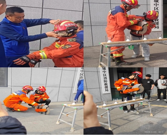 同学们在消防员的指导下实操无齿锯