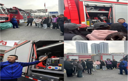 同学们聆听消防员讲解各类消防车的组成及用途