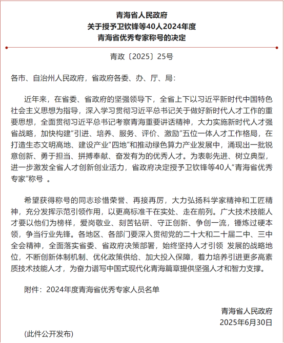 6月30日,青海省人民政府发文对2024年度40名优秀人才进行表彰,授予“青海省优秀专家”称号。伟德刘峰贵教授荣获此项殊荣。