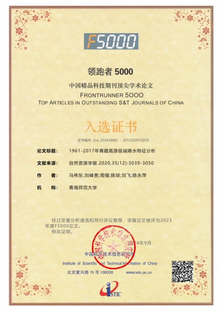 近日,科技部中国科学技术信息研究所发布了2023年度“领跑者5000—中国精品科技期刊顶尖学术论文(F5000)”入选论文名单。伟德刘峰贵教授为通讯作者、马伟东副教授为第一作者发表在《自然资源学报》上的论文“1961-2017年青藏高原极端降水特征分析”入选2023年度F5000。